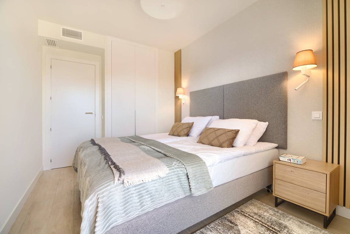 Outside, the apartment offers two private outdoor areas: a garden accessed from the master bedroom and a garden-terrace linked to the living space — ideal for relaxing, dining al fresco or enjoying the sun. The gated complex features a communal pool, a fully equipped gym and a co-working area that supports flexible living.